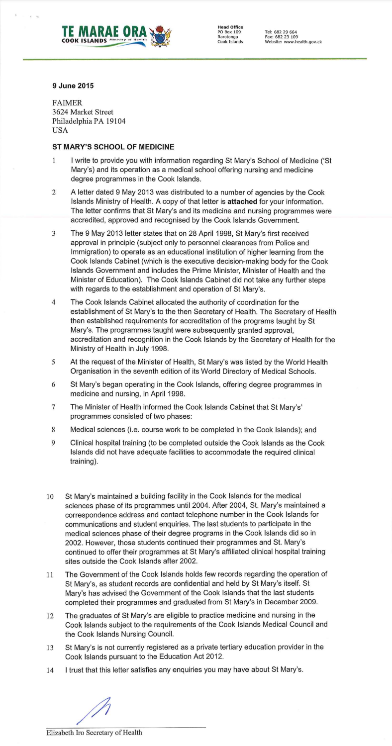 APPROVAL AND ACCREDITATION St. Mary’s School of Medicine was founded in 1998. The Government of Cook Islands Cabinet approved the St. Mary’s School of Medicine on April 28, 1998 to operate as an educational institution of higher learning offering nursing and medical programs. The nursing and medical programs were subsequently granted accreditation and recognition by the Government of the Cook Islands Ministry of Health on July 28, 1998. Note: - Confirmation of the approval and accreditation granted by the Government of the Cook Islands to the St. Mary’s School of Medicine nursing and medical education programs issued by the Government of the Cook Islands to FAIMER (Foundation for Advancement of International Medical Education and Research); CGFNS (Commission on Graduates of Foreign Nursing Schools); and WES (Word Education Services).