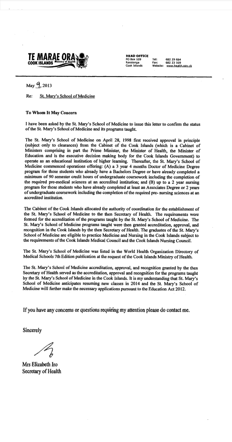 APPROVAL AND ACCREDITATION St. Mary’s School of Medicine was founded in 1998. The Government of Cook Islands Cabinet approved the St. Mary’s School of Medicine on April 28, 1998 to operate as an educational institution of higher learning offering nursing and medical programs. The nursing and medical programs were subsequently granted accreditation and recognition by the Government of the Cook Islands Ministry of Health on July 28, 1998. Note: - Confirmation of the approval and accreditation granted by the Government of the Cook Islands to the St. Mary’s School of Medicine nursing and medical education programs issued by the Government of the Cook Islands to FAIMER (Foundation for Advancement of International Medical Education and Research); CGFNS (Commission on Graduates of Foreign Nursing Schools); and WES (Word Education Services).